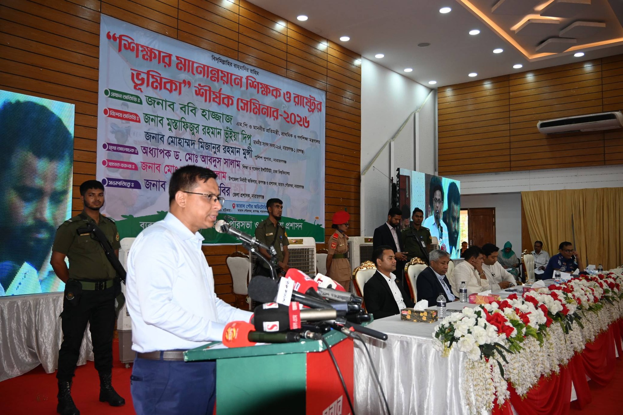 সেমিনারে বিশেষ অতিথি হিসেবে উপস্থিত থেকে নারায়ণগঞ্জ-১ (রূপগঞ্জ) আসনের সংসদ সদস্য জনাব মুস্তাফিজুর রহমান ভূঁইয়া দিপু স্থানীয় পর্যায়ে শিক্ষার প্রসারে বিভিন্ন পদক্ষেপের কথা তুলে ধরেন। অনুষ্ঠানের মুখ্য আলোচক ঢাকা বিশ্ববিদ্যালয়ের শিক্ষা ও গবেষণা ইনস্টিটিউটের খ্যাতিমান অধ্যাপক ড. মোঃ আবদুস সালাম তাঁর বক্তব্যে আধুনিক ও বৈশ্বিক প্রেক্ষাপটে শিক্ষা ব্যবস্থার বিবর্তনের চিত্র ফুটিয়ে তোলেন। সভাপতির বক্তব্যে নারায়ণগঞ্জ জেলা প্রশাসক জনাব মোঃ রায়হান কবির বলেন, প্রযুক্তিগত উৎকর্ষের এই যুগে শিক্ষকদের নিজেদের নিয়মিত দক্ষ ও আধুনিক জ্ঞানসম্পন্ন করে গড়ে তোলা অত্যন্ত জরুরি।